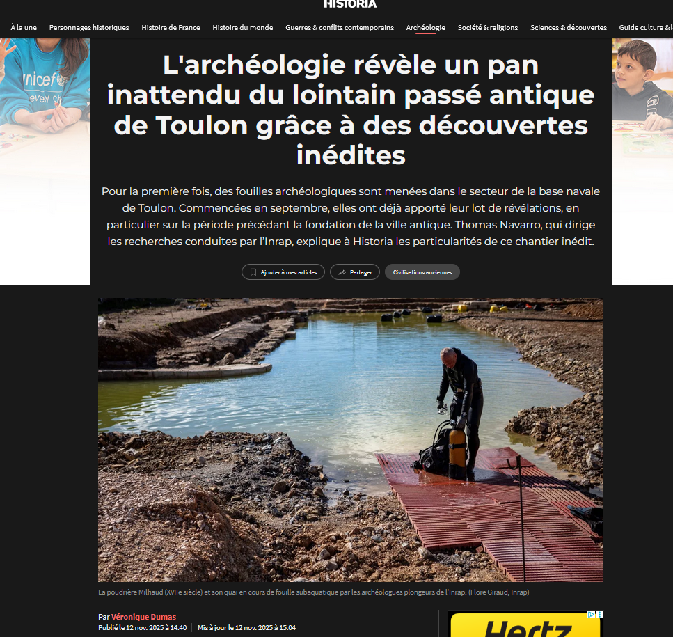 Article- « L’archéologie révèle un pan inattendu du lointain passé antique de Toulon grâce à des découvertes inédites »-Revue Historia- 12 novembre 2025