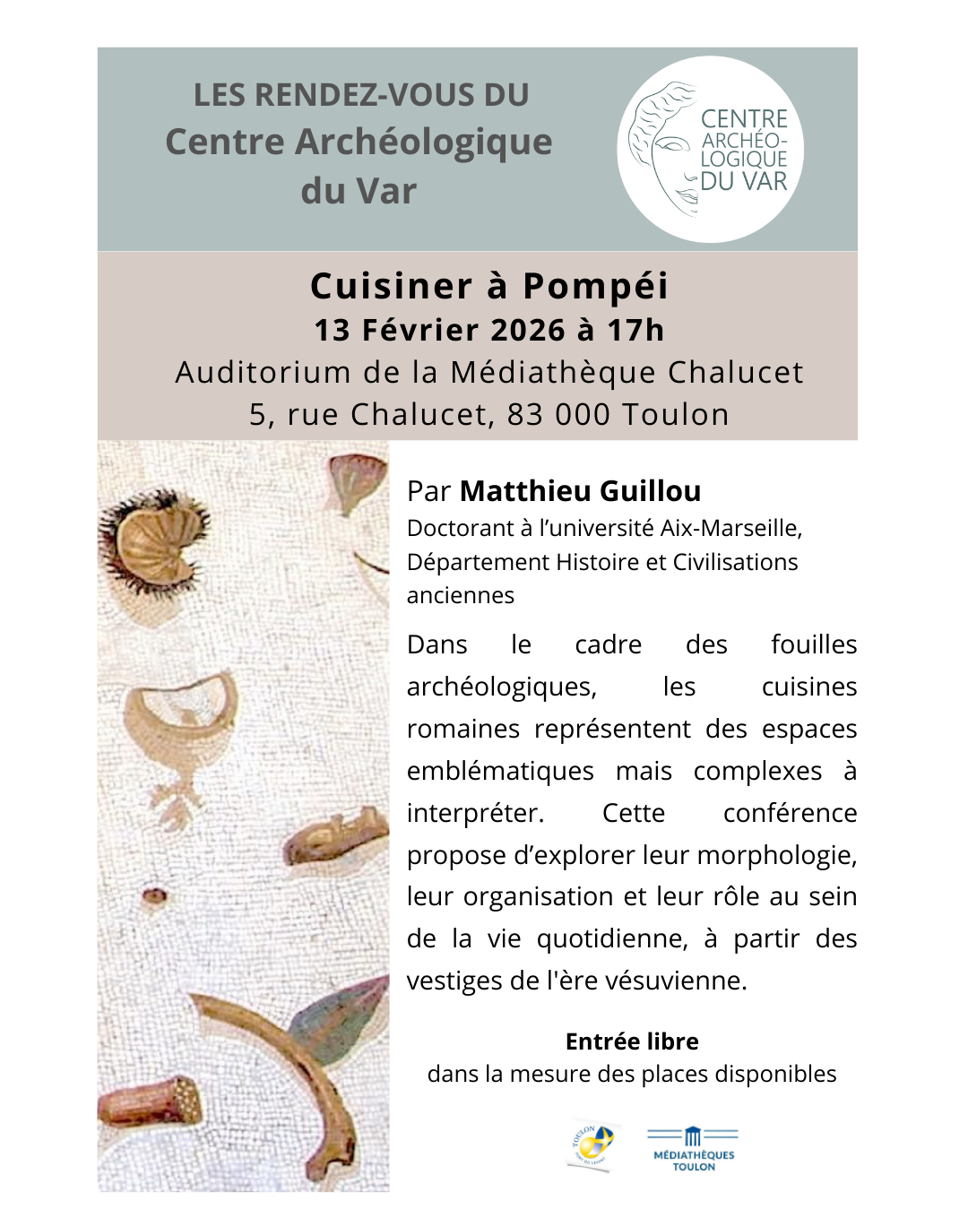 🥣 Nous vous donnons rendez-vous vendredi 13 février 2026 pour une conférence au sujet de la cuisine à Pompéi, par Matthieu Guillou, doctorant à l’université Aix-Marseille.